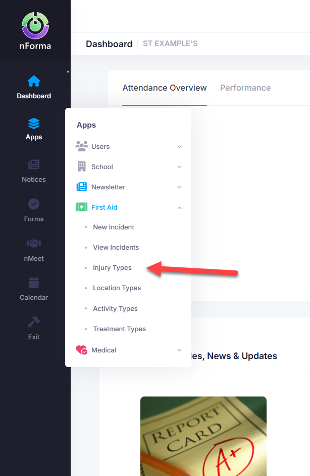 Prior to using the First Aid module, you will need to populate your injury types. These can be a bruised elbow, blood nose, headache, etc. for example. Injury types can be different for all schools as some like to be generic and others prefer to be more detailed. Hence, it is better that you populate them to make them better suited to your school.