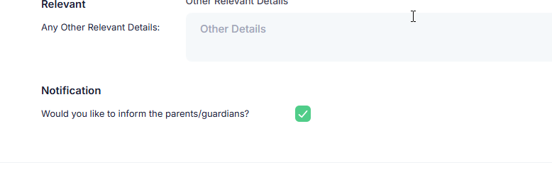 The notify parents tick box at the bottom of the First Aid report is there to flag that the current report will be emailed to the parent sometime in the future. If the tick box is not selected, the report will not be emailed to the parent. Even if you select the email parent or the email today's incidents options.