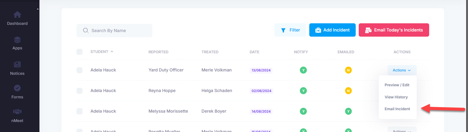 Yes, First Aid reports can be emailed instantly or can be bulk emailed later in the day. To email an incident immediately, once the incident is saved, click on the “Actions” drop down and then “Email Incident”. Confirm that you wish to email it and that report will be sent to the parents.