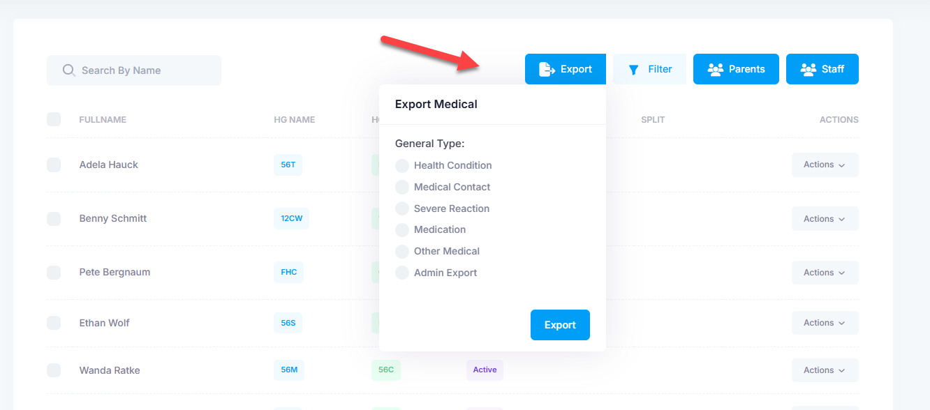Yes you can export all medical data. To export, go into "Apps", "Users" and "Students". Click on the "Export" button and select the fields you would like to export. This will then export as a excel document which can be filtered and formatted by you.