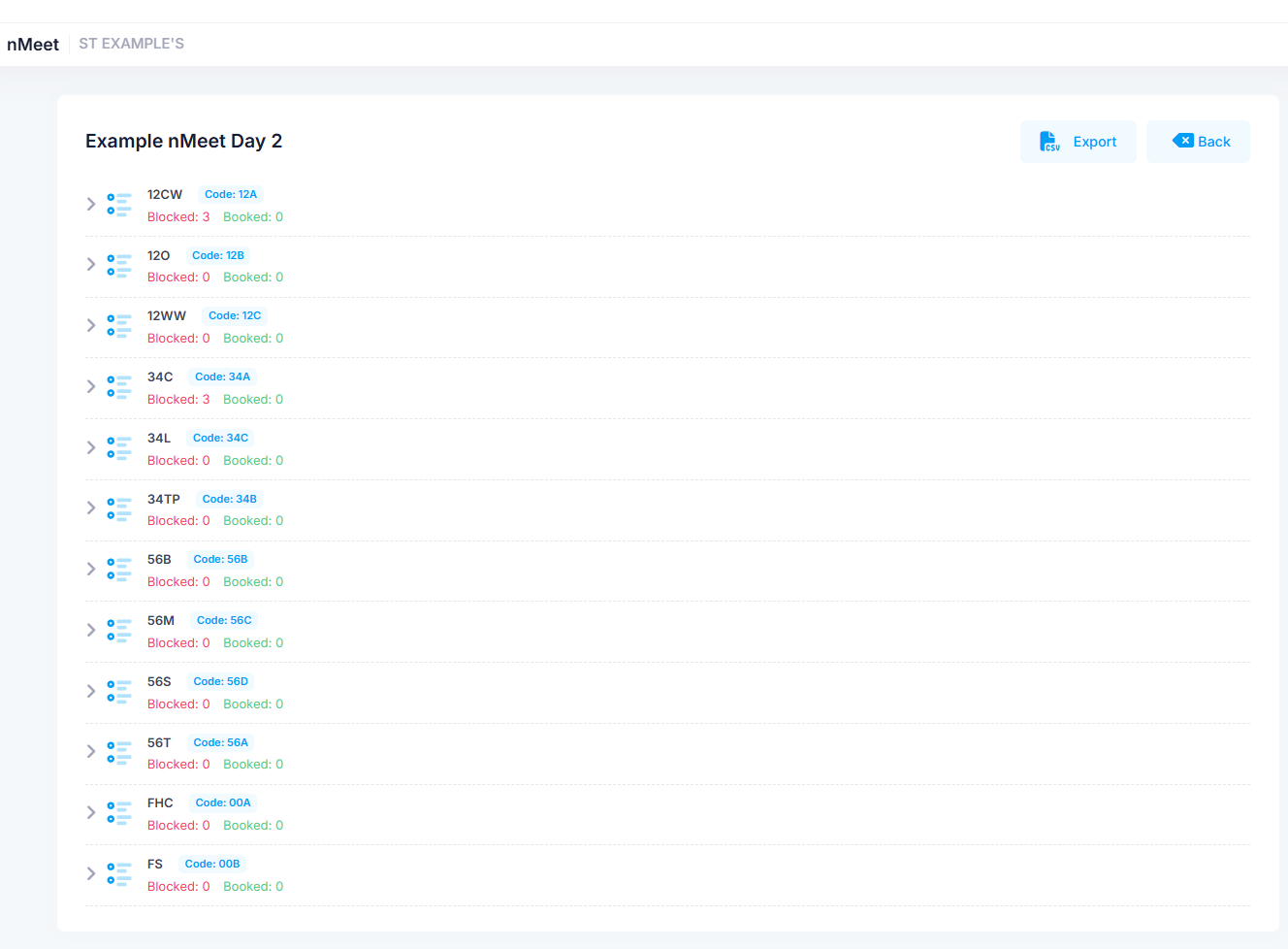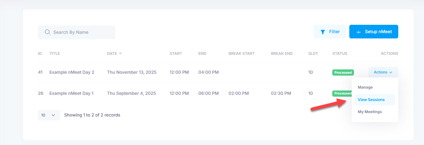 Administrators have the ability to check all sessions for the nMeet. To do this, go into the “Actions” drop down of the selected nMeet session. Select “View sessions”. You will then be shown all the selected home groups for the nMeet. Select the home group and you will see who has booked each time slot.