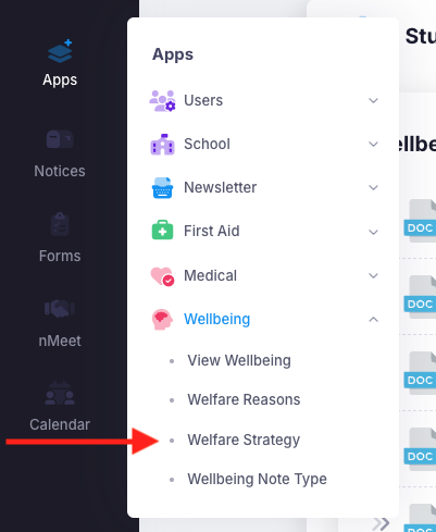 Prior to using the Wellbeing module, you will need to populate your Welfare strategy types. These can be extra support, group work, parent meetings, etc. for example. Welfare strategy types are different for all schools, hence, it is better that you populate them to make it better suited to your school.