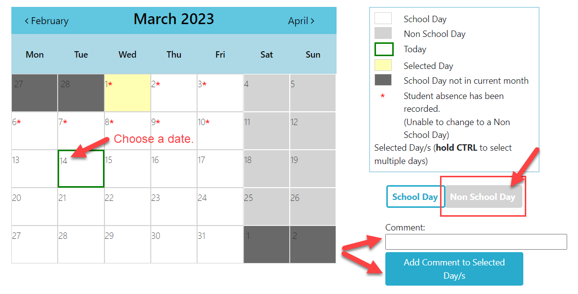 Choose the required date from the calendar. Select "non school day" and add a comment.