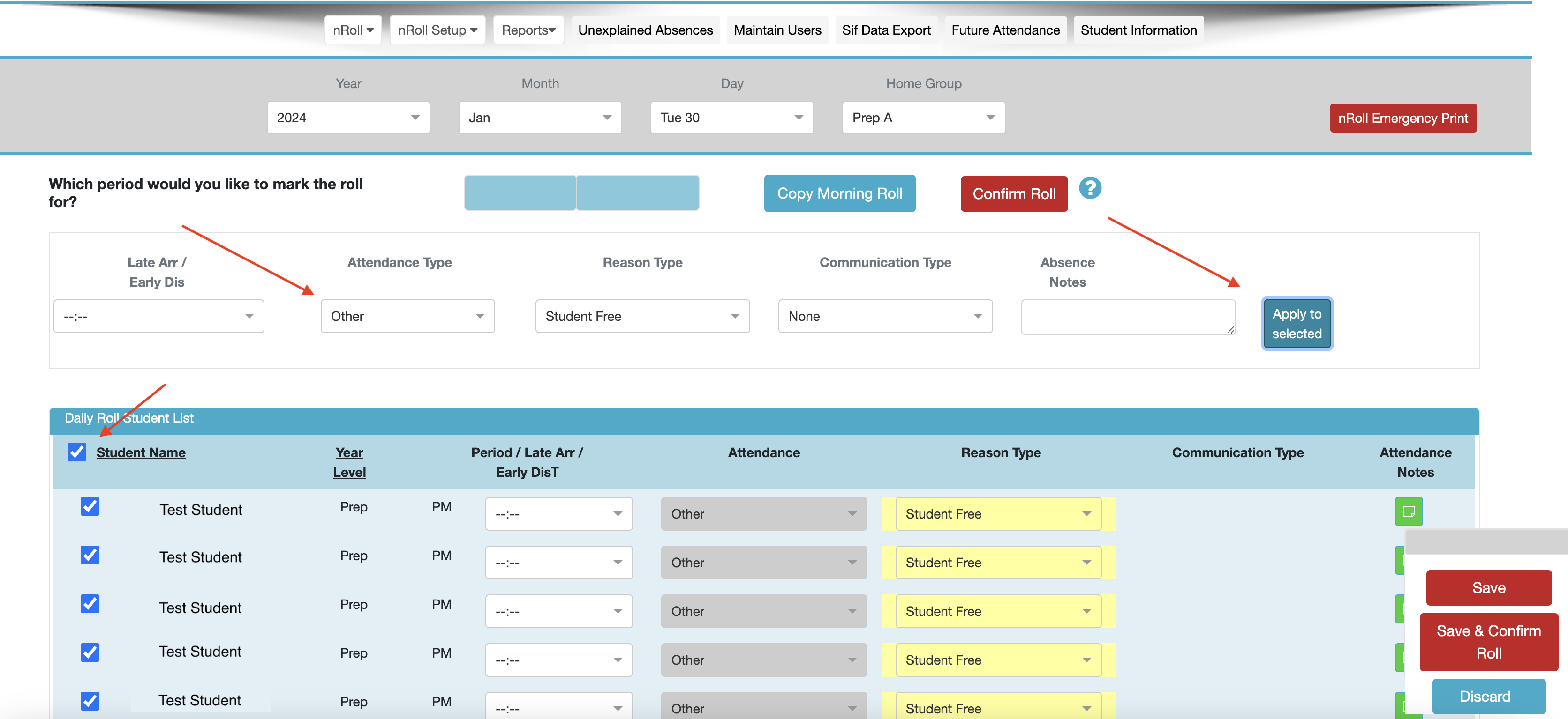 To mark a class as absent due to a closure, go into "nRoll" and select the required home group. Once there, click the tick box next to "Student Name". Change the "Attendance Type" to "Other". By doing this, the student will not have an absent count to their semester report. Select the wanted reason type and then "Apply to selected". "Save and Confirm the roll".