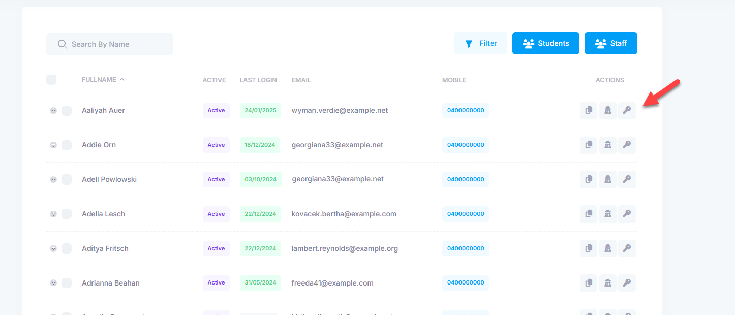 Once there, type the parents name or email in the search bar. Once the parent appears, click the Key icon on the far right of the page.