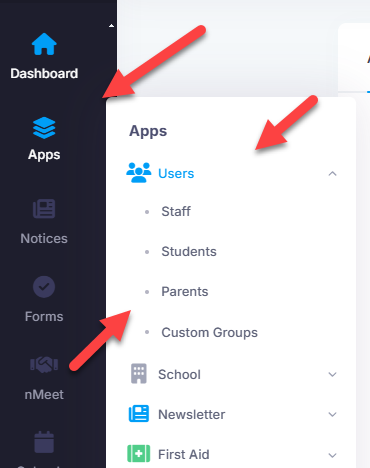 To check if a parent has logged into the Portal, you will need to go into the "Apps" module, click on "Users" and select "Parents".