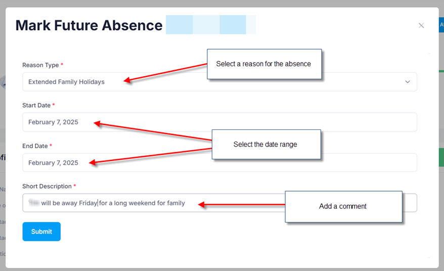 They then enter the details of the absence: