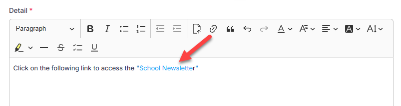 - In "Detail" enter a statement similar to "Click on the following link to access the "School Newsletter" (where the word "School Newsletter" will be a hyperlink to the school public newsletter URL).