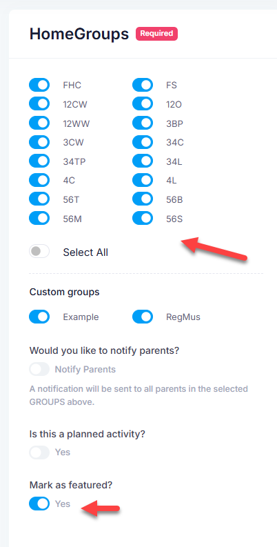 - Select the Home Groups that you want to send a notification about the newsletter being ready to be viewed by the school community. "Mark as featured" if you want to pin it to the top of the notices list on the dashboard
