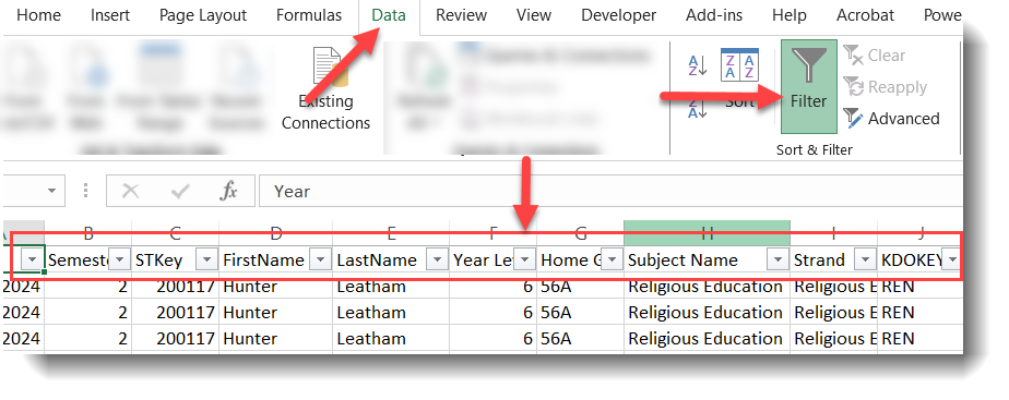 To make viewing of the data in the Excel file easier, apply the FILTER so that teachers can filter the data they require e.g. filter by Year Level, Name etc